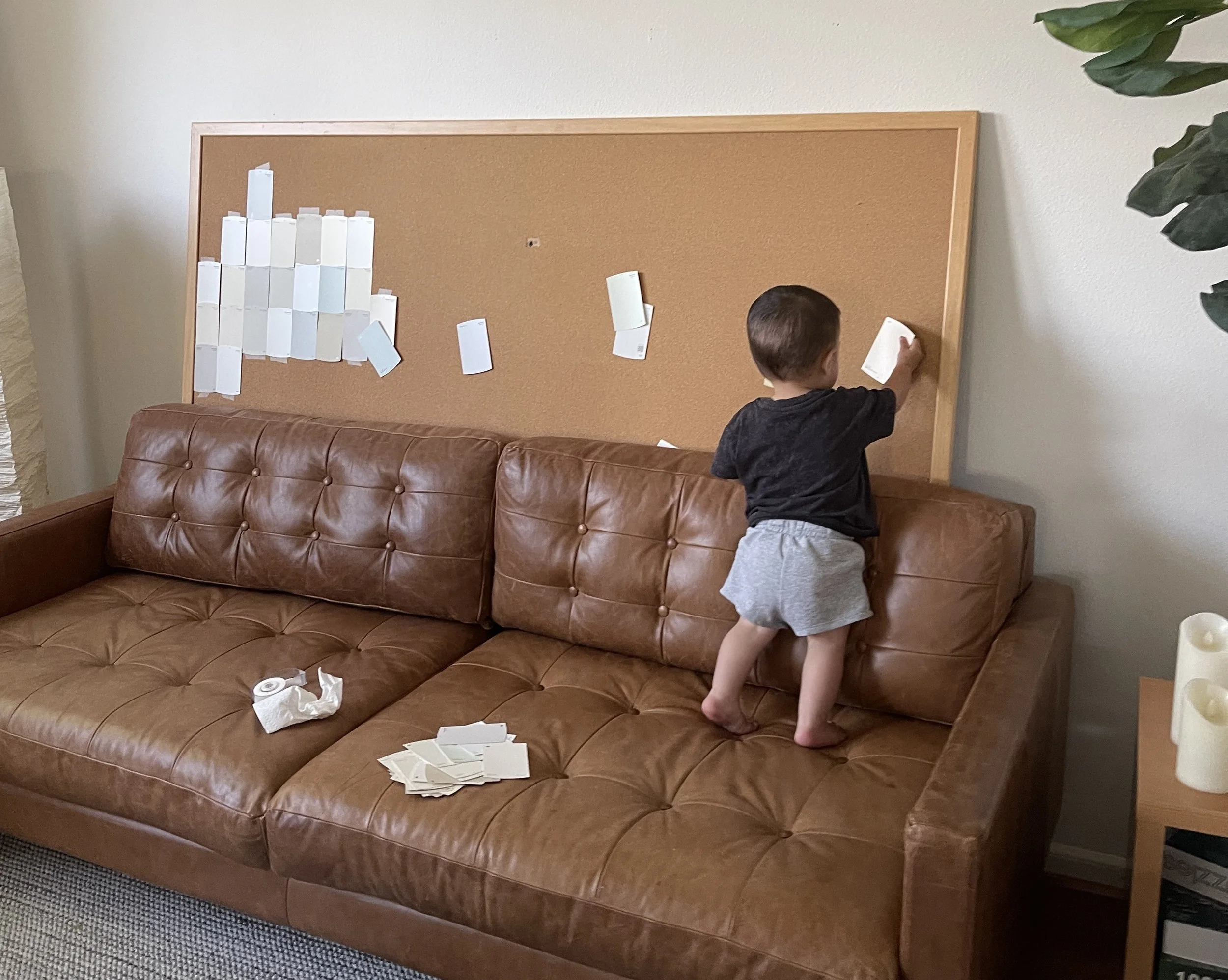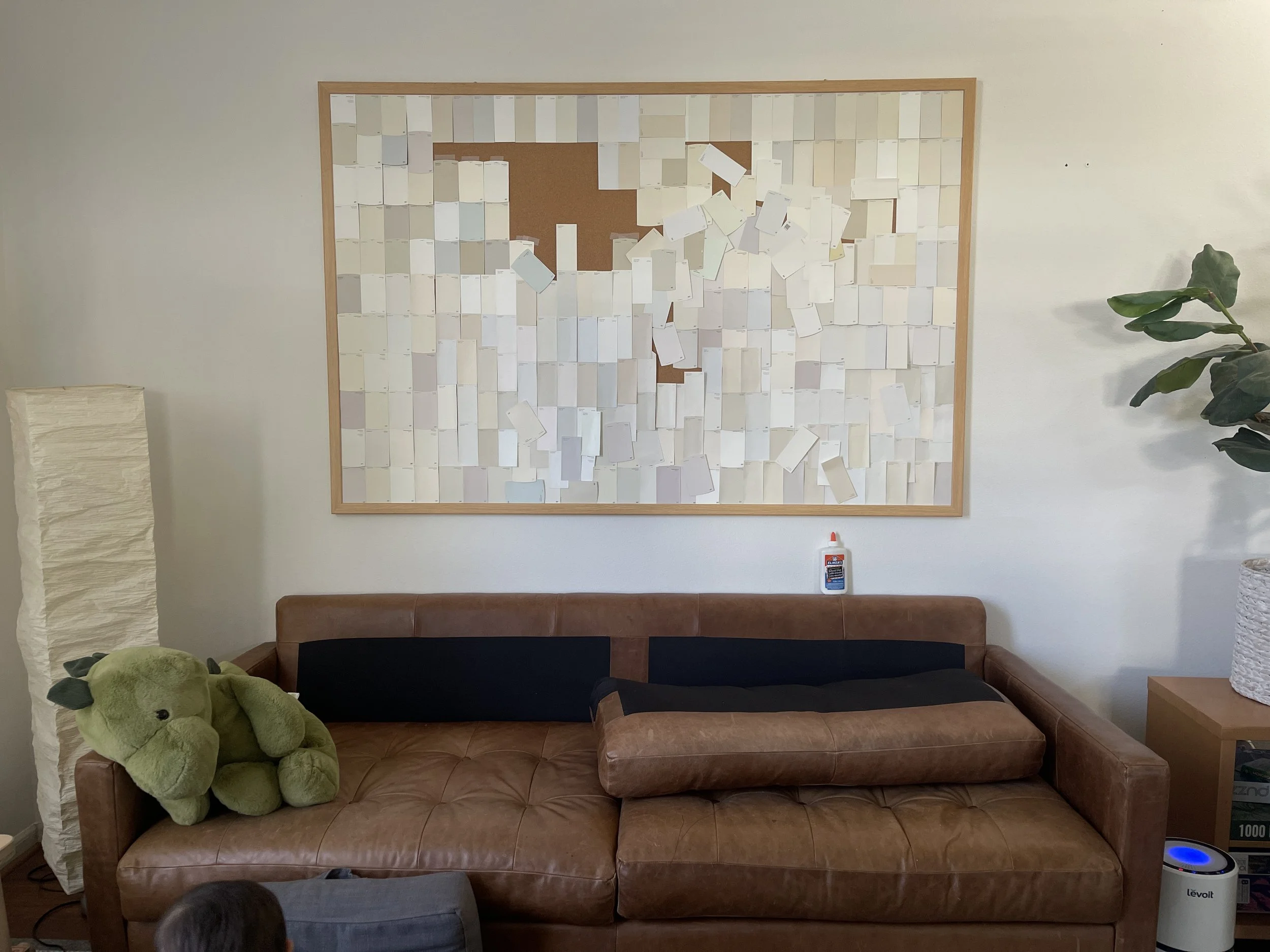 Large art is usually pretty pricey, but very luckily we happened to have a huge bulletin board that used to be in little guy's room (little guy is bigger now and enjoyed tearing things off of it so we removed it haha) that was the perfect size to hang over the couch. I had the idea to add paint chips (free!) in a grid to make something that felt modern, had a little texture, a little color variation, but still kept that minimal blank slate feeling.